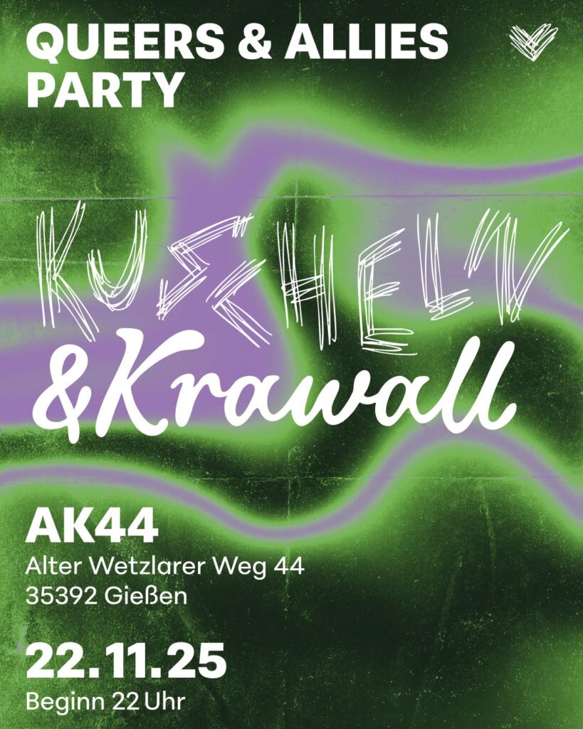 Am 22.11.2025 im AK44 ab 22 Uhr ist es wieder soweit, die Nacht zum Tag zu machen!! Soli-Party –> alle Einnahmen sind für das queere & feministische Bühnenprogramm am 29.11. Kuscheln & Krawall wird 1 Jahr alt!! 🥹 Kuscheln & Krawall bedeutet ausgelassene Atmosphäre, feurige Beats und funkelnde Lichter 💥 Unser Ziel ist es, einen Safer Space zu ermöglichen, in dem sich insbesondere queere Menschen wohlfühlen und eine tolle Zeit haben können 🌈🧡 Bist Du eine FLINTA*-Person und hast oft genug das Patriarchat am eigenen Leib erfahren?