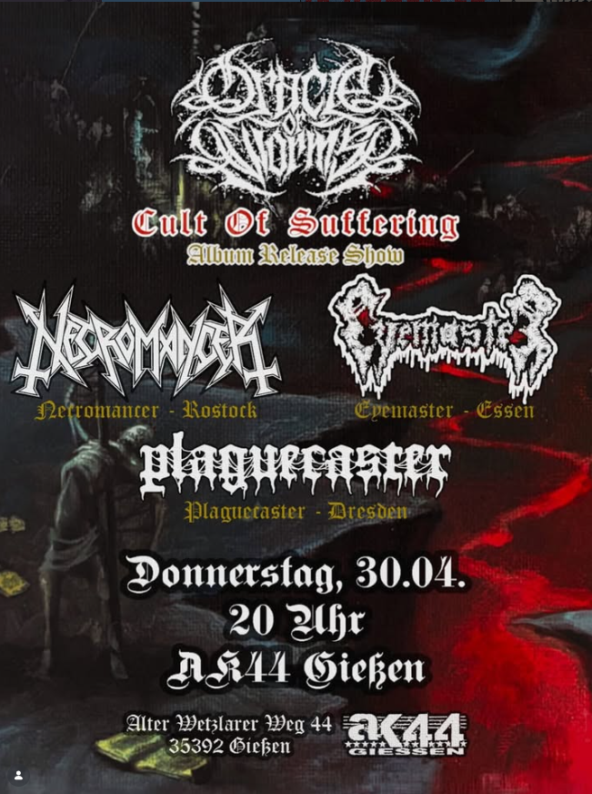 furious Blues Rock with a strong diy Punk attidute from Madrid https://williekarma.bandcamp.com/ 70‘s psychedelic Rock n Roll from Barcelona „….die volle Packung Death Metal im AK!„ Mit dabei sind: HM-2 worshipping blend of black metal, death metal and crust, featuring members of Depravation, Eraserhead, Blizzen, Reflexor and Derelyction. ORACLE OF WORMS releasen am 21.04. ihr Debüt-Album „CULT OF SUFFERING“ via Fucking Kill Records, FDA Records & Sapivon Records, um das gebührend zu feiern gibt’s am 30.04. die volle Packung Death Metal im AK! Underground music for underground people. Open for Submissions. A new inferno is rising: A relentless storm of Black/Speed Metal with vicious Punk edge. No polish. No compromise. Just raw unfiltered rebellion. Charged by Punk – Poisoned by Metal!! Blackened Death Metal! NO DISCRIMINATION // NO DISCUSSION More information soon… MINENFELD // MANØVER // YOGTZE MINENFELD – Death Metal Crust – Osnabrück