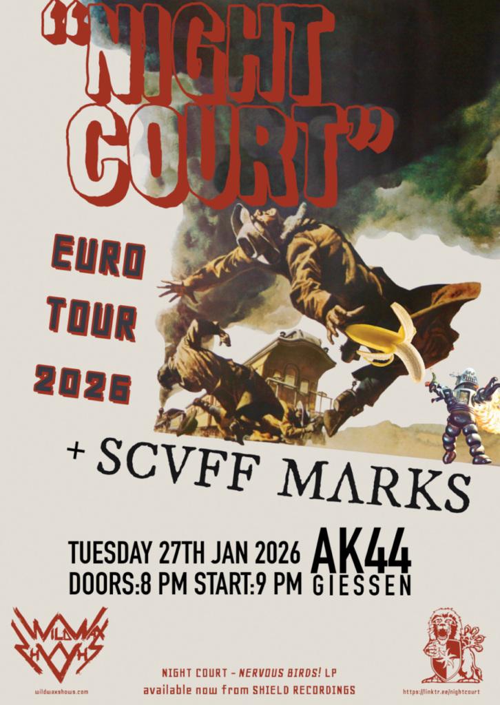 Naaa kleiner Stern, wolltest du schon immer mal Leuten deinen coolen Partytrick zeigen, aber irgendwie hat es sich noch nie ergeben?🤸🏾♀️ Oder hast gerade etwas neues gelernt, worauf du stolz bist und teilen möchtest? 🤹🏻♀️Oder hast Lust der Welt etwas cooles mit deiner Bestie vorzuführen? 👯♀️ Oder hast vielleicht einfach mal Lust, kreative Flintas* in Action zu sehen? 👩🏫 ++Linker Soli-Flohmarkt und Verschenkemarkt in Gießen++ Ihr möchtet Gegenstände los werden, die für den Müll zu schade sind? Ihr sucht schöne oder nützliche Dinge und möchtet kein oder wenig Geld dafür ausgeben? Es ist wieder soweit – wir veranstalten unseren Soli-Flohmarkt am 25.01.2026! ++27.01.26++AK 44++21:00++ ++27.01.26++AK 44++21:00++ Das Power Trio NIGHT COURT aus Vancouver spielt rohen, eingängigen Lo-Fi-Indie-Punk Kaum ein Song ist länger als 2 Minuten. Laut, chaotisch, melodisch und wie gemacht für kurze Aufmerksamkeitsspannen (: Support kommt von unseren Friends SCUFF MARKS – Postpunk aus der hessischen Provinz – geht das?! Aber so richtig! Eingängige Melodien ohne Melancholie. Viel Wut. Viel Punk. House Music All Nite – TBA – – TBA –